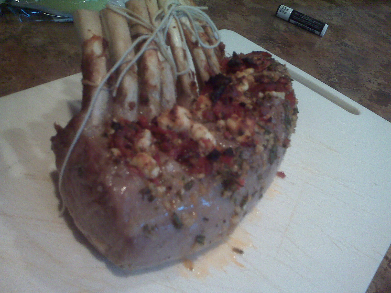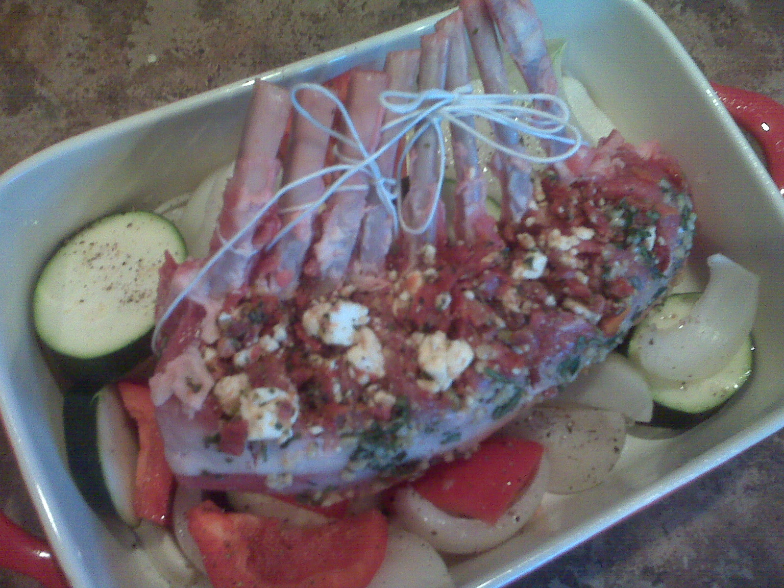 To make a complete meal, I put the lamb right on top of vegetables in a roasting dish. I then cooked it for about 20-25 minutes for a rare/mid-rare doneness. I then let the lamb rest for about 10 minutes, while i put the veg back in the oven.