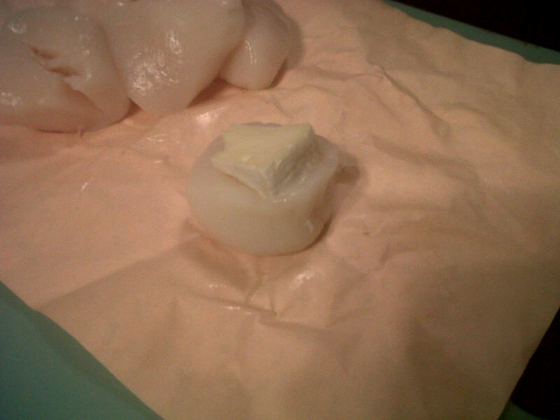 This is the simplest way to make an appetizer! Preheat your oven to 400F. Assemble the scallops as followed. Place a piece of brie on the top of the scallop.