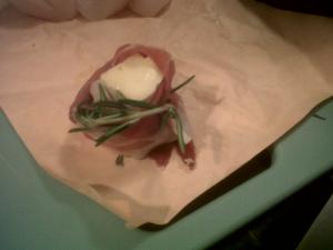 *We cut a small slice on the side of the prosciutto, inserted the base of the spring inside and tucked the other end to secure it.