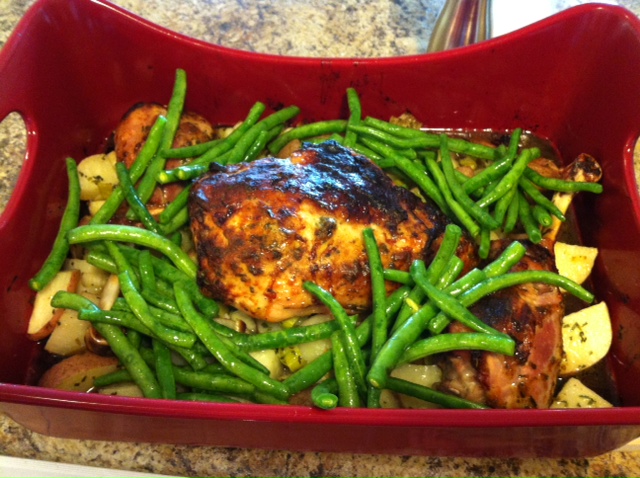 After 45 minutes, remove dish from oven, remove turkey from dish, set aside. Place potatoes in baking dish and place turkey on top of potatoes. Roast about 45 minutes.