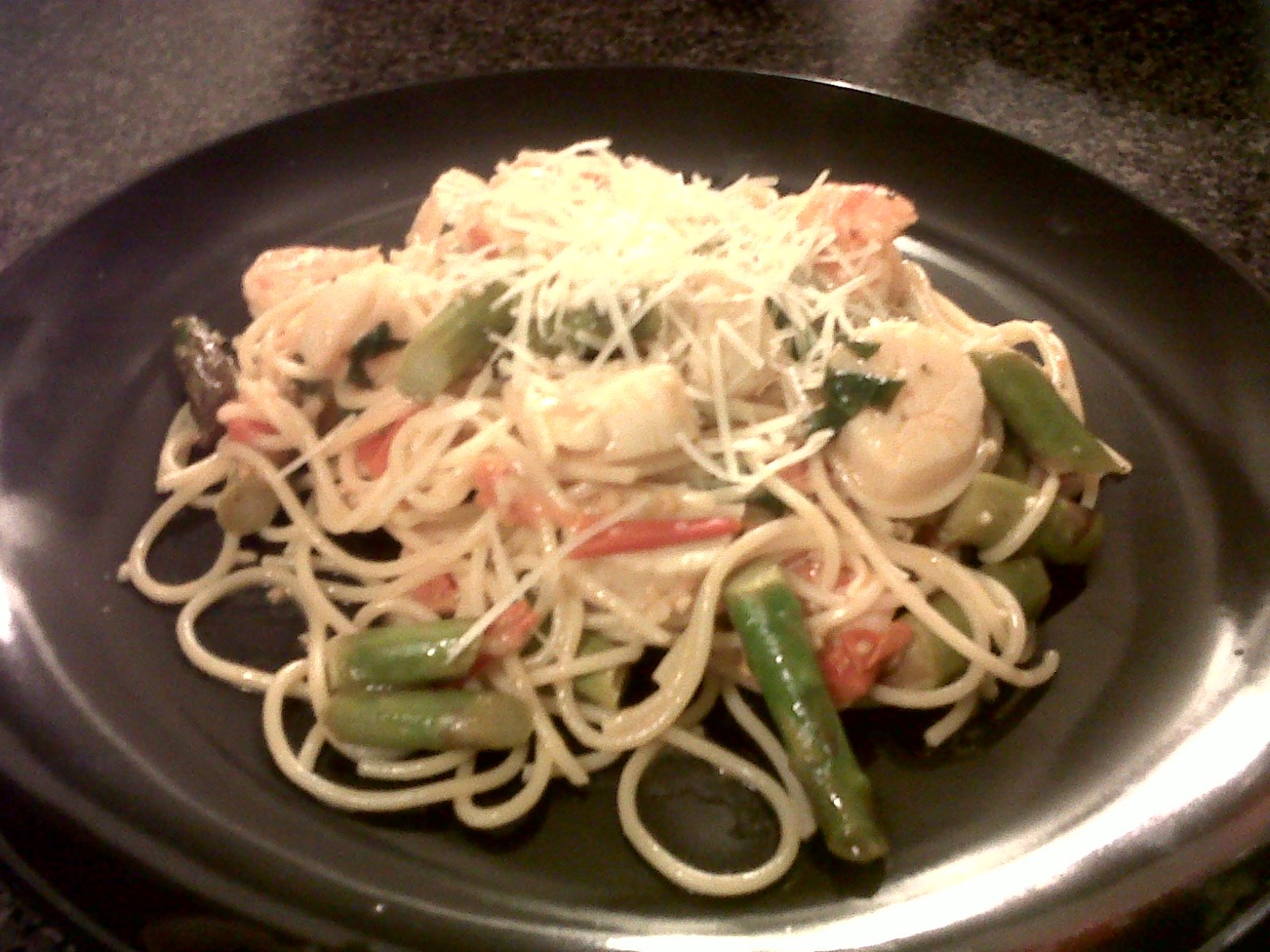 Stir in shrimp. Cook for 1 minute, stirring constantly. Add the butter. Cook until butter melts, stirring constantly. Add the cooked pasta, tossing to mix allowing the pasta to absorb the sauce. Serve with grated Parmesan.