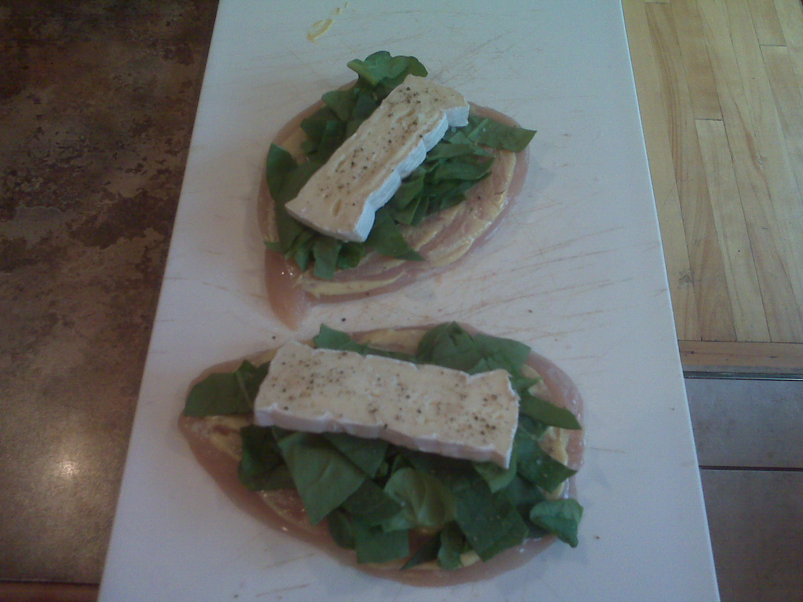 Here I spread Dijon Mustard on the chicken, and topped it with chopped spinach, brie and salt and pepper.