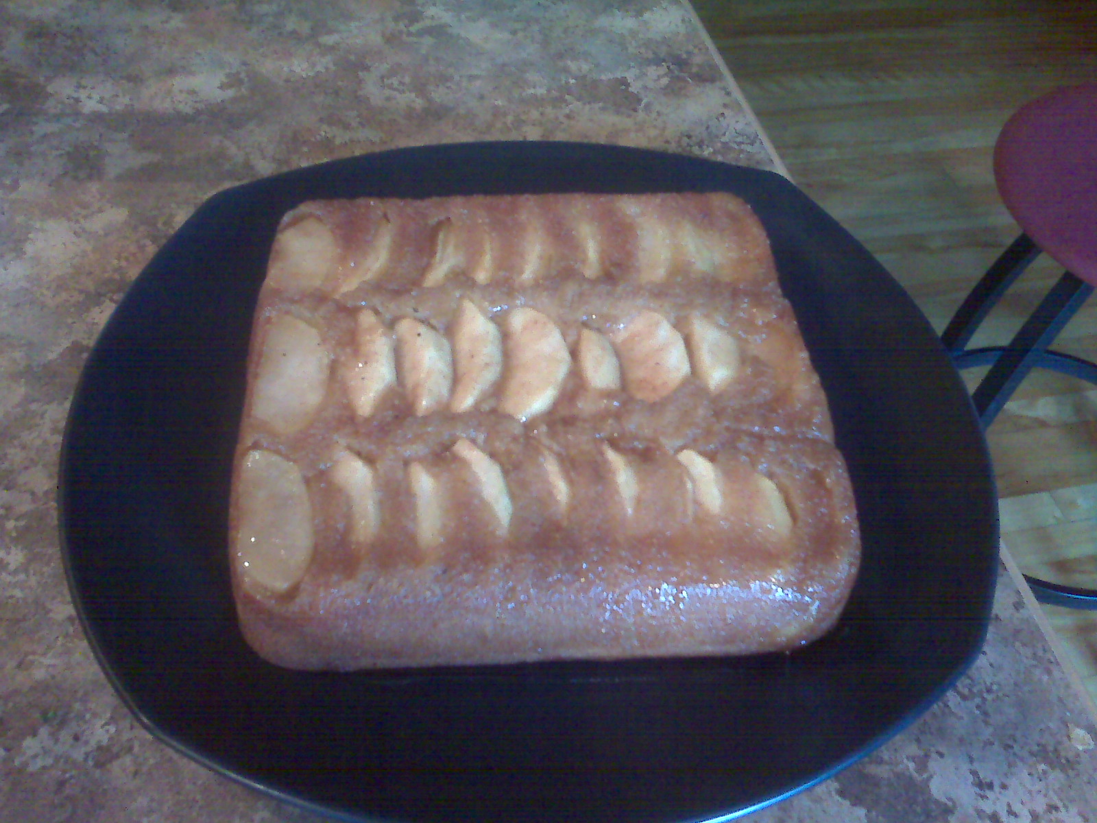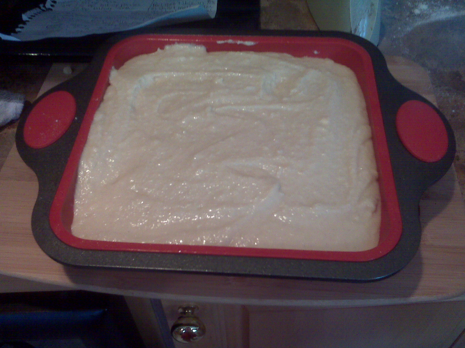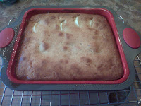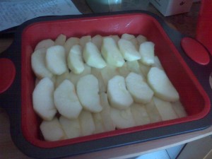 In separate bowl, I whisked the flour, cinnamon, baking powder and baking soda. Alternating the flour mix and milk, I mixed it all toghet and then spread the cake mix over the apples.