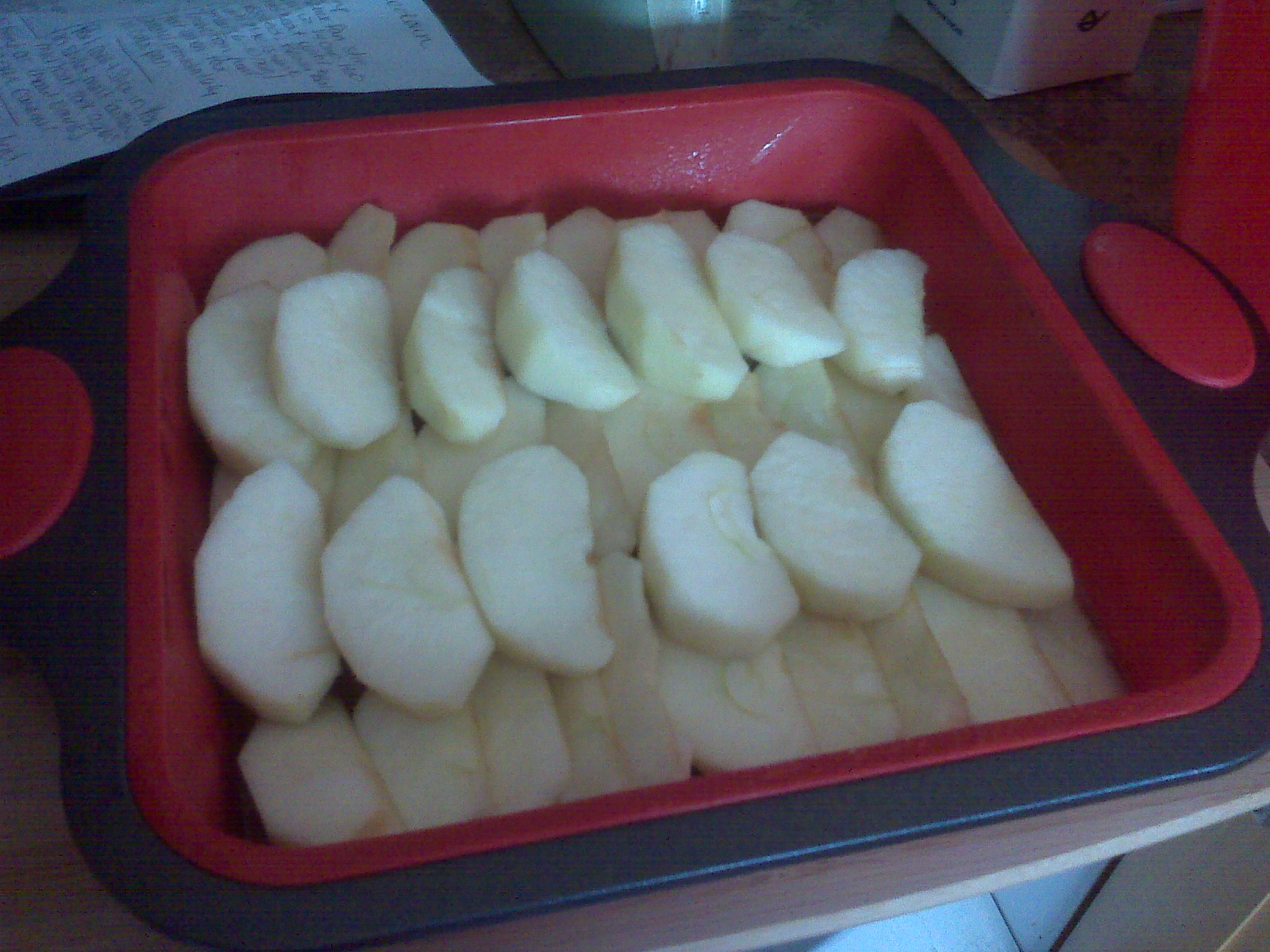 Peel core and slice in 1/8 slices. In skillet, melt butter medium heat. Cook apples, stirring occasionally until apples are cooked. (about 10 minutes) Arrange over sauce. Set aside.