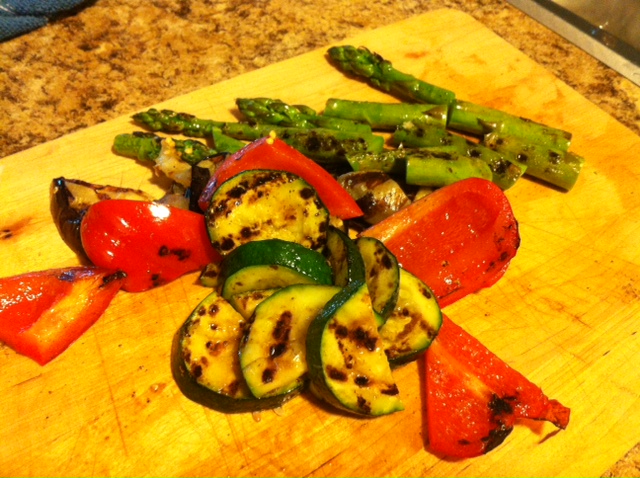 Preheat a grill or grill pan over a medium-high heat. Grill the vegetables in batches until both sides are nicely charred and the vegetables are just tender, about 10 minutes for the pepper, about 8 minutes for the eggplant and onion, and about 6 minutes for the zucchini.