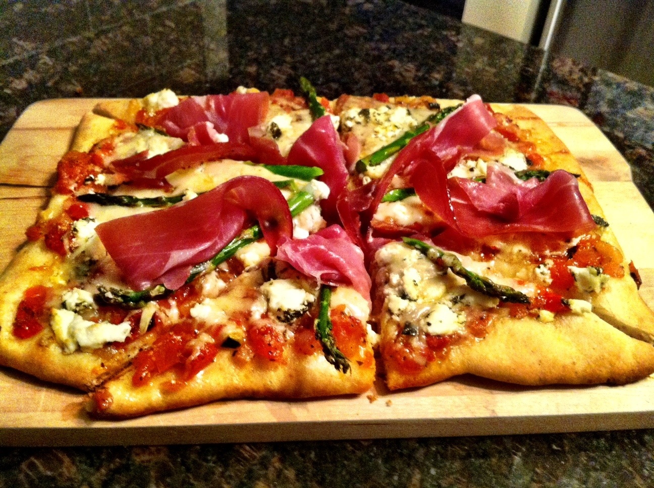 Place the dough on a pan or pizza stone. Brush with oil and top with bruschetta mix, asparagus, parm & goat cheese. Bake for 12-15 minutes until pizza is puffed and the crust is crisp and golden on the sides and bottom.
