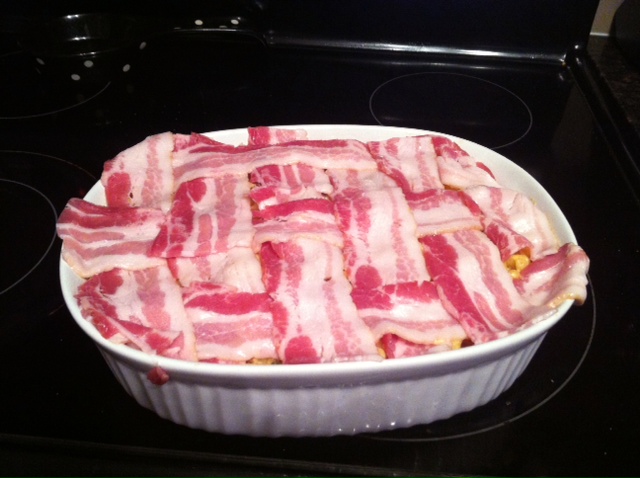 Place pasta mixture into an oven safe dish. Weave a bacon top layer over the dish and cook for 20 minutes – until bacon is cooked and crisp.