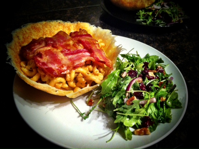 I served my Gourmet Mac & Cheese in a Parmesan Cheese Bowl with a mixed green salad.