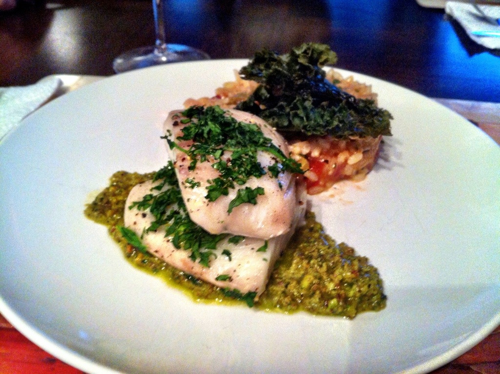 Place fish over the tapenade. Serve with Tomato & Olive Risotto (using my standard Risotto Recipe, and adding 1 can of diced tomatoes, sliced olives, capers and parsley) and top with Kale Chips.