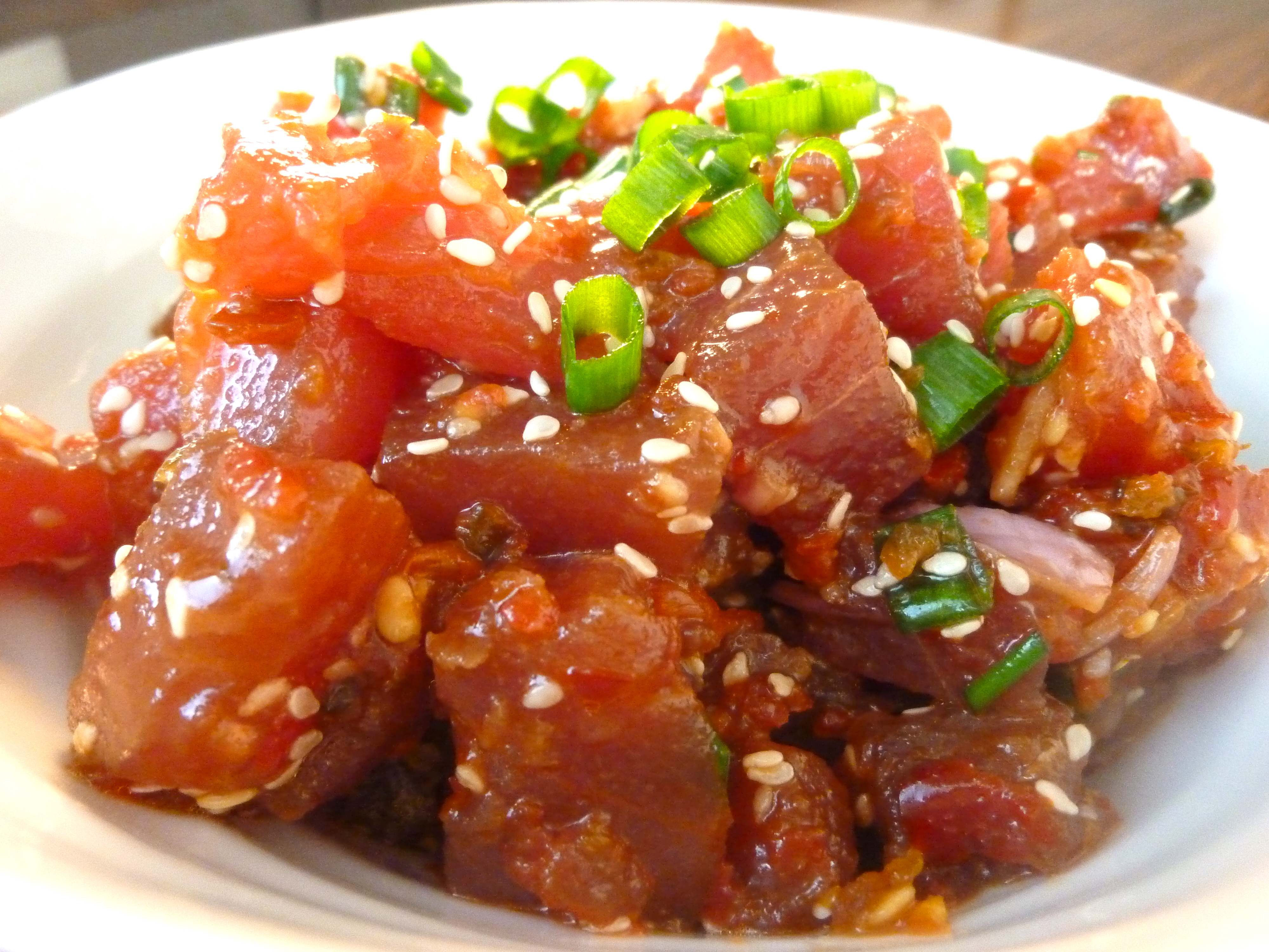 This cubed ahi tuna sashimi marinated with sea salt, soy sauce and seaweed is a traditional salad served in Hawaii. You may find some other variations containing other types of raw tuna, or salmon, with onion, hot sauce and tomato.
