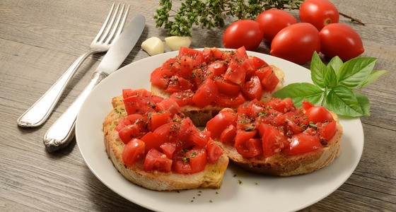 Bruschetta means “toast”, and that’s exactly what it is, toasted baguette rubbed with garlic and topped with oil and tomatoes…. Mmmm sounds delightful!