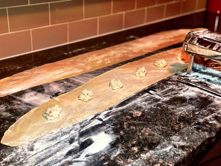 Lay the pasta sheet on a floured surface. Add about a tablespoon of the lobster mixture a few inches apart. Create an egg wash (1 egg with 1 tablespoon of water) and brush the egg wash around the lobster mixture. This will make sure the pasta sheets seal and do not open while cooking. Place another pasta sheet on top of the pasta sheet with the lobster mixture. Carefully press around each filling mixture making sure there are no air pockets and the pasta is well sealed. You can use a pasta stamp or pizza cutter to cut out the raviolis. Carefully place the raviolis on a floured baking sheet and continue the process until you are out of dough or filling. If you have leftover dough, you can store it in the freezer for up to 3 months.