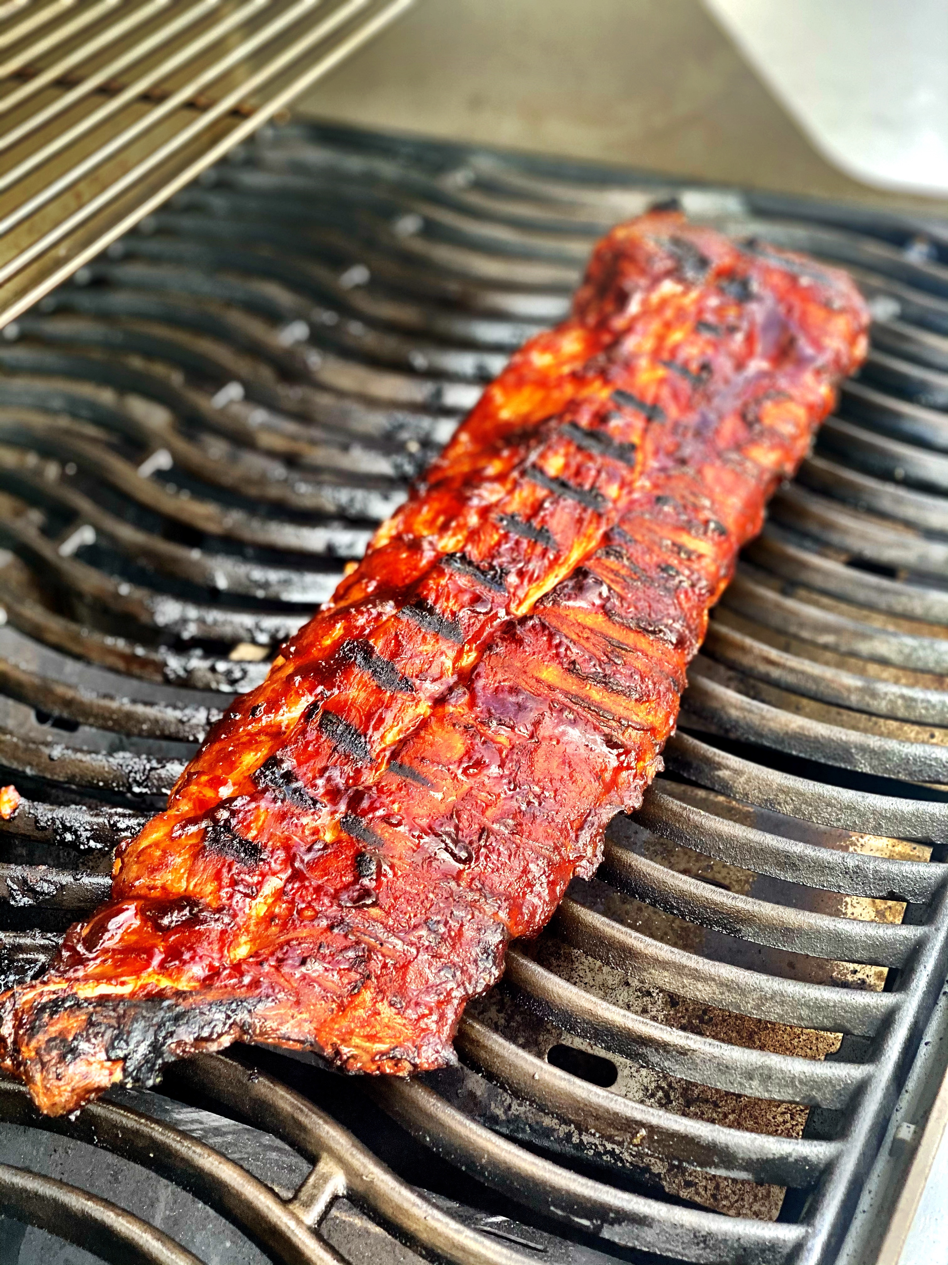 Pre-heat the BBQ to medium-high heat. Remove the roasting pan from the oven and carefully transfer the ribs to a cutting board. Add another layer of BBQ sauce, place the ribs on the grill and cook about 5 minutes on each side, until browned and slightly charred. Cut the ribs into individual ribs or quarter racks, brush with more sauce and serve.
