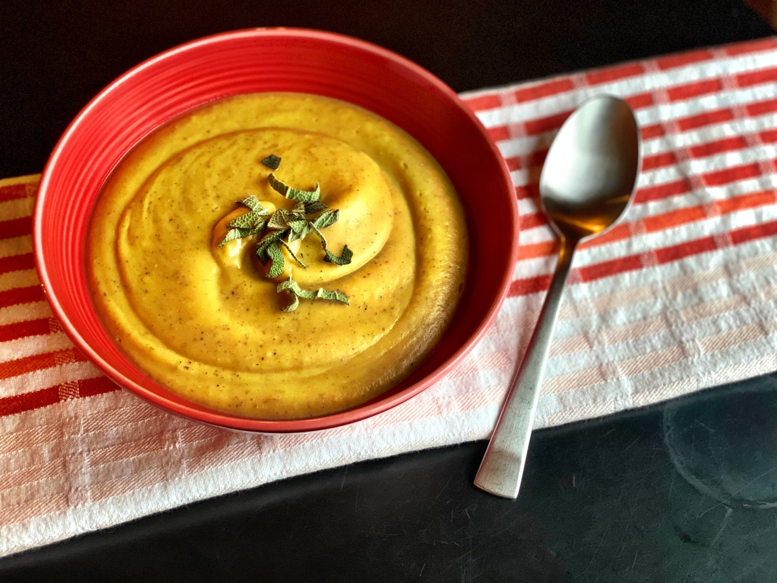 In a large pot, heat olive oil on medium heat. Add the onion and cook for about 5 minutes. Add the butternut squash, garlic, ginger, cinnamon and nutmeg. Cook for about 10 minutes, string occasionally, until the butternut squash starts to soften.