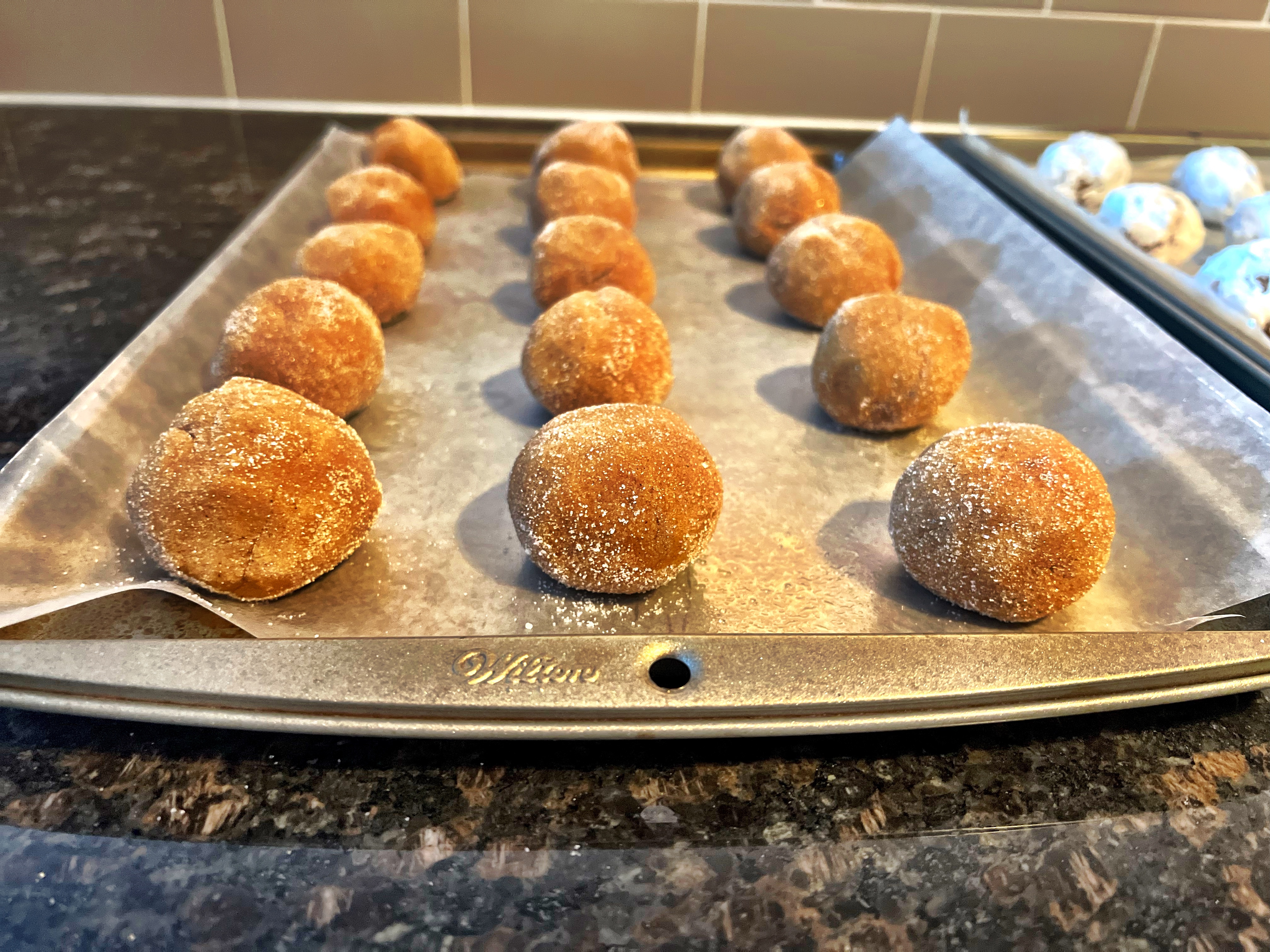 Remove dough from fridge and roll into 2” balls. Dip the balls in sugar and place on greased or lined cookie sheet at least 2 inches apart.