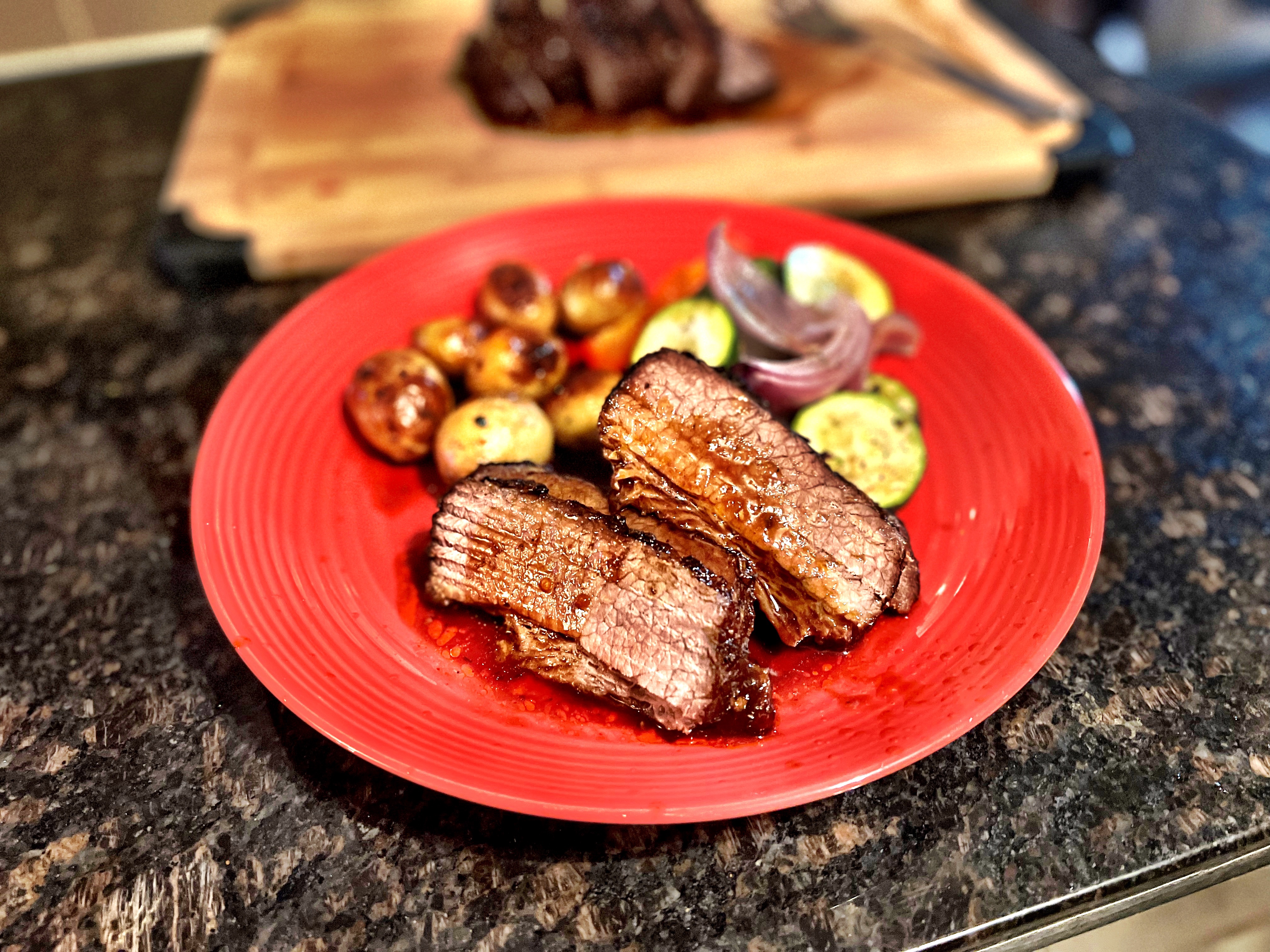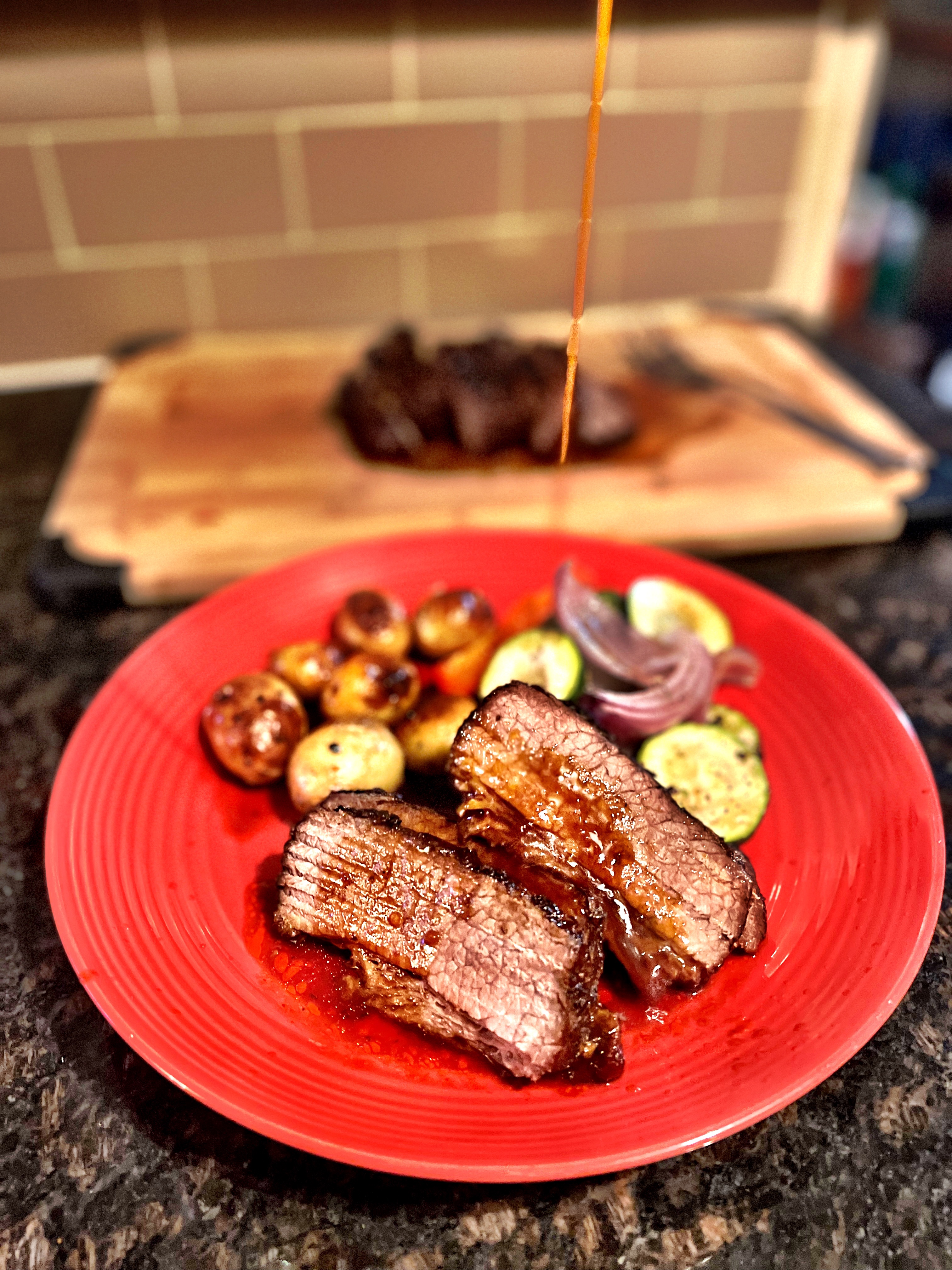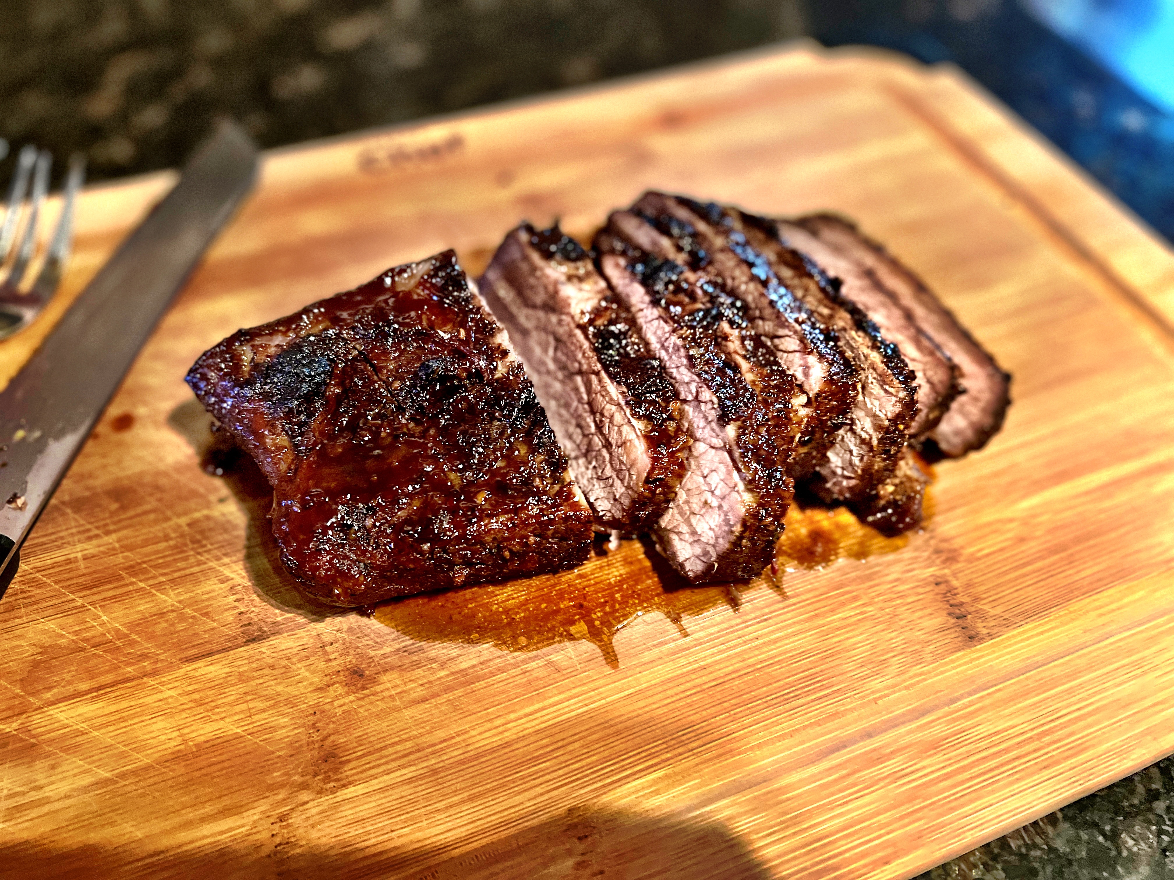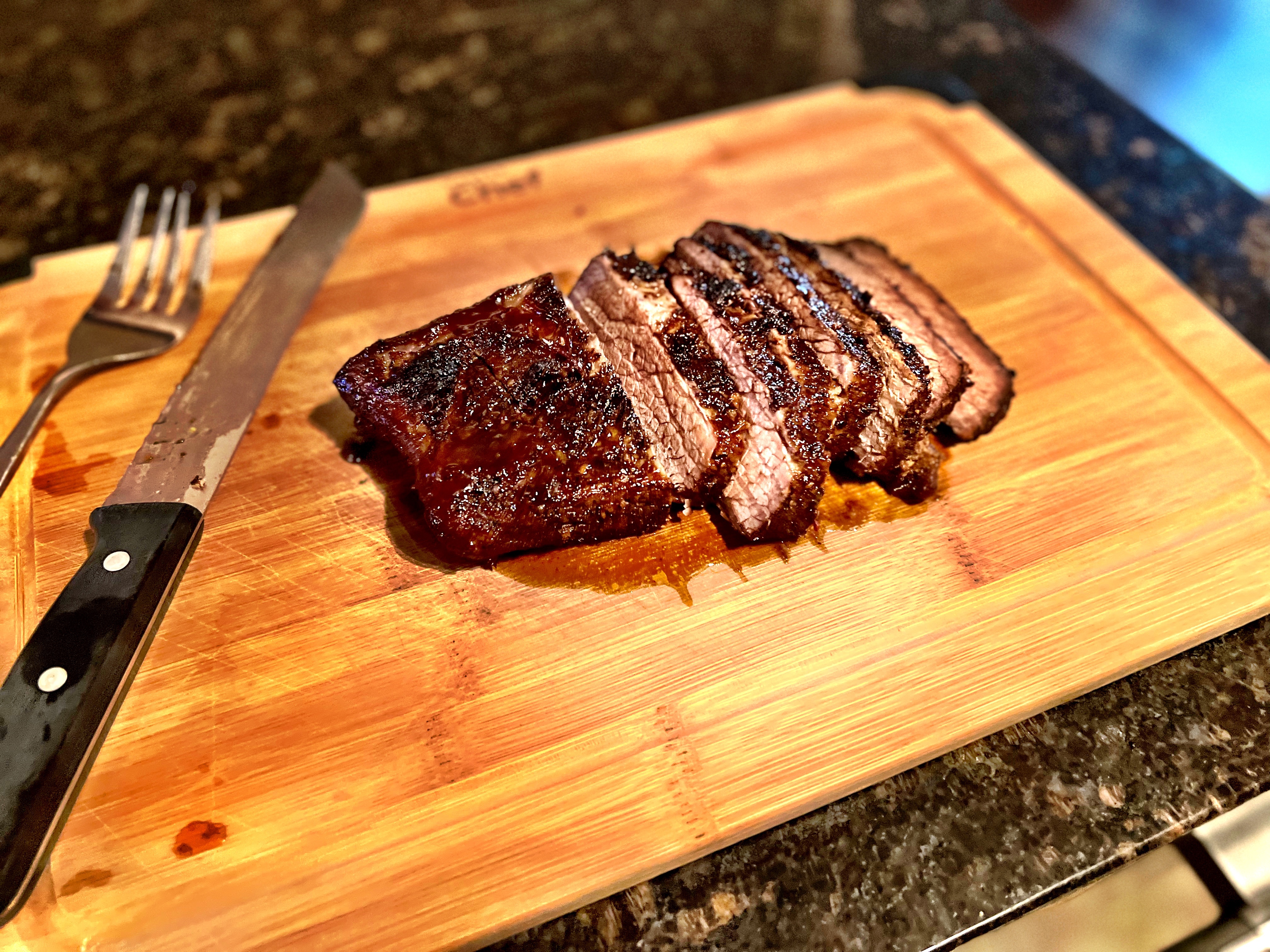 Place the brisket in the oven and broil for about 5-10 minutes to create a bark. Make sure to keep an eye on the brisket to make sure it does not burn. Once the outside gets darker, remove from the oven, cover with foil and let rest for 15 minutes.